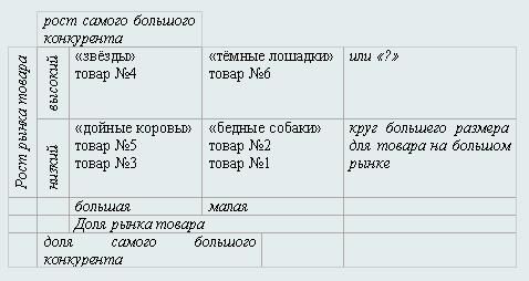 Матрица, предложенная Бостонской Консультативной Группой (БКГ) представляет собой один из наиболее известных инструментов стратегического анализа номенклатуры фирмы, так называемого портфолио-анализа. Эта матрица позволяет предприятию классифицировать продукцию по ее доле на рынке относительно основных конкурентов и темпам годового роста в отрасли: